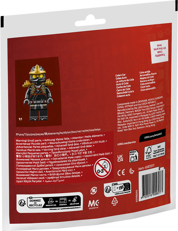 Børn fra 6 år kan glæde sig til vilde eventyr på hjul med en miniudgave af en supersej ninjabil, der køres af en Cole-minifigur bevæbnet med et gyldent sværd.