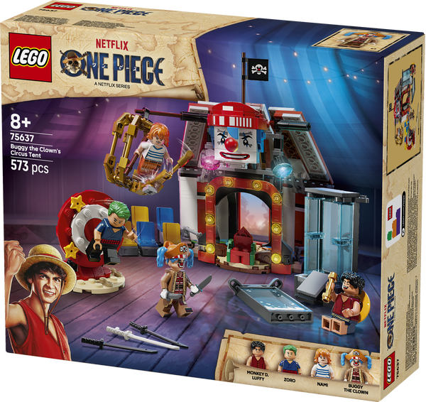 LEGO® ONE PIECE sættet Klovnen Buggys cirkustelt (75637) tager børn med på et ONE PIECE-cirkuseventyr. Det anime-inspirerede LEGO legetøj til drenge og piger fra 8 år har masser af tilbehør, der hjælper børn med at udspille deres yndlingsscener fra liveaction-serien ONE PIECE og inspirerer dem til at skabe deres egne fantasifulde eventyr. Byggesættet indeholder minifigurer af Luffy, Zoro, Nami og piratkaptajn-klovnen Buggy. Byggemodellen af cirkusteltet kan vendes rundt for at skabe et større legeområde med aftagelige stolesektioner og Buggys trone. Der er 3 cirkusanordninger, som heltene skal flygte fra: en vandtank, et drejeligt hjul med skydeskive og et hængende bur. I teltet er der kasser og tønder med elementer til at bygge en mindre version af Buggy. Der er masser af seje våben og tilbehør, bl.a. 2 "Wanted"-plakater. For at få ekstra digitalt sjov kan byggere zoome ind på og dreje modeller i 3D samt følge deres fremskridt i den intuitive LEGO Builder app. Indeholder 573 elementer.