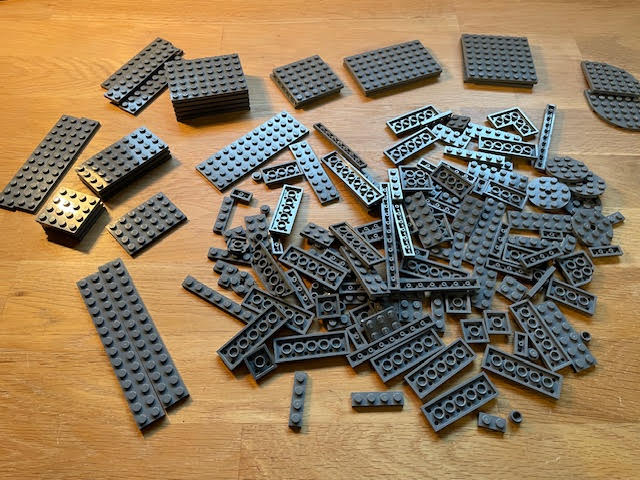 Plader, Mørkegrå 001 (farven "dark bluish gray" på Bricklink) - 250gram blandede plader, se billede for indholdet. Hvad du ser på billedet, er det der følger med.
